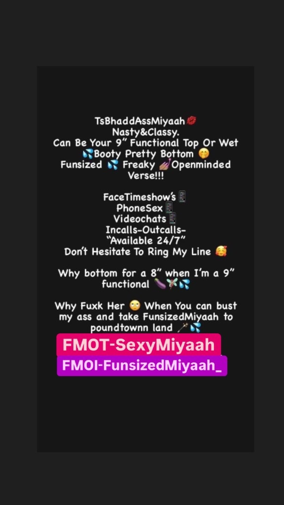 INCALLS & OUTCALLS AVAILABLE 🤗 Real Deal 💅🏽💋 420 Friendly-PartyyyGirll X-SexyMiyaah OpenMinded & Ready To Please 🥰🤗 And Get Pleased 🎁💦 Look No Further I Can Be Your 9" Functional Top Or Wet Bubble Butt Bttm "SERIOUS-INQUIRES ONLY" *📲 Facetimeshows-Videochats *🛍VideoDeals-VideoPackages *💋GFE-OVERNIGHTS *🚗CarPlay